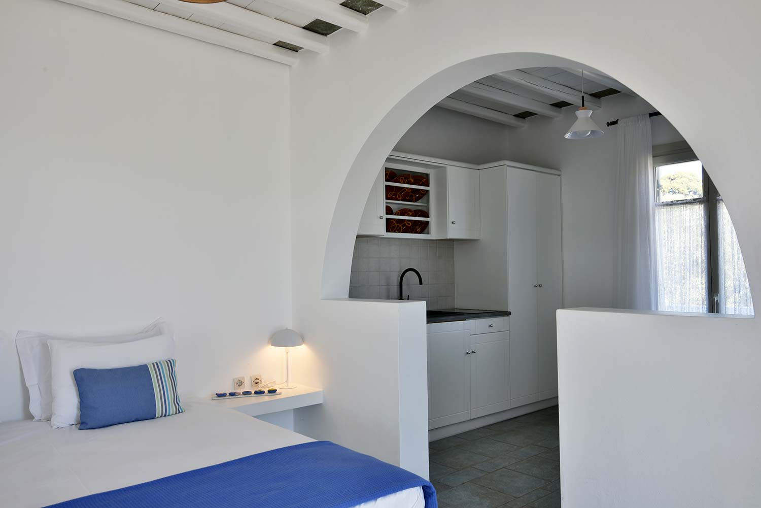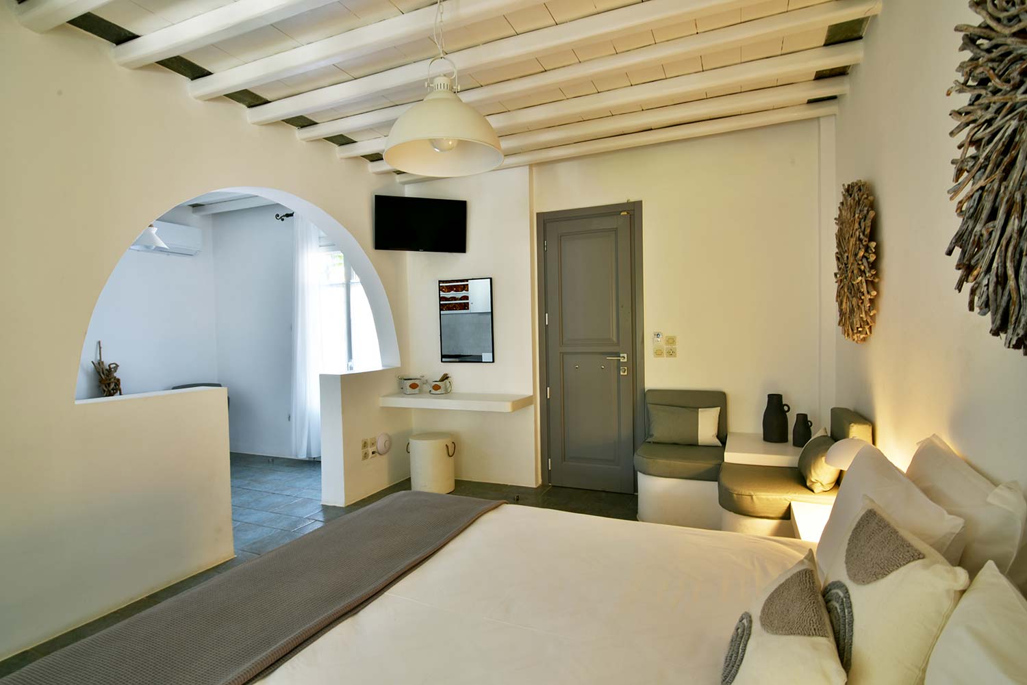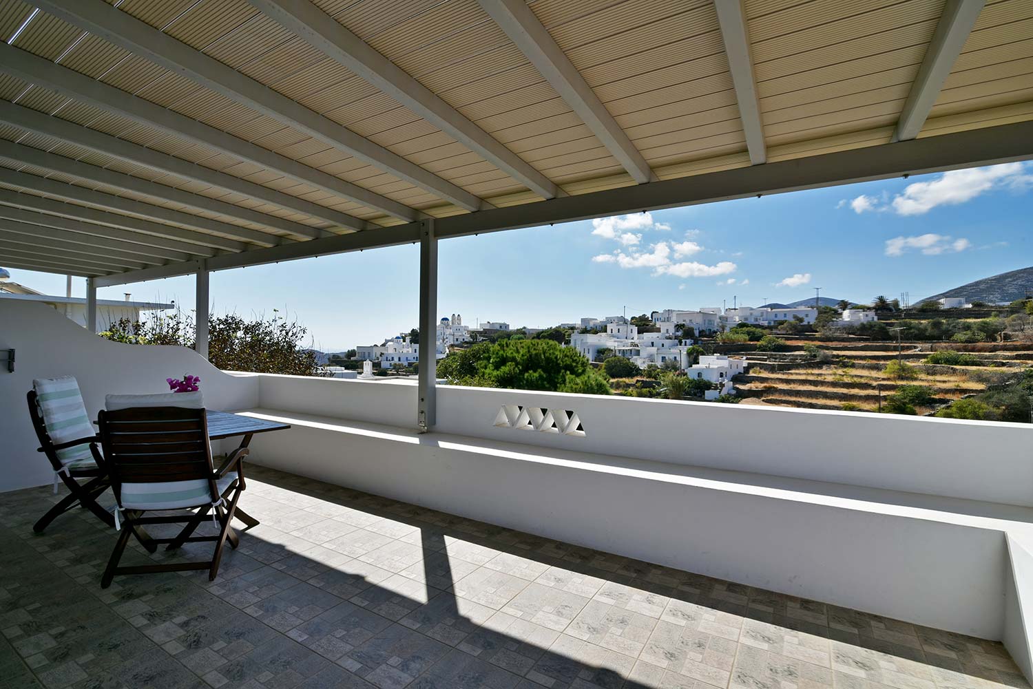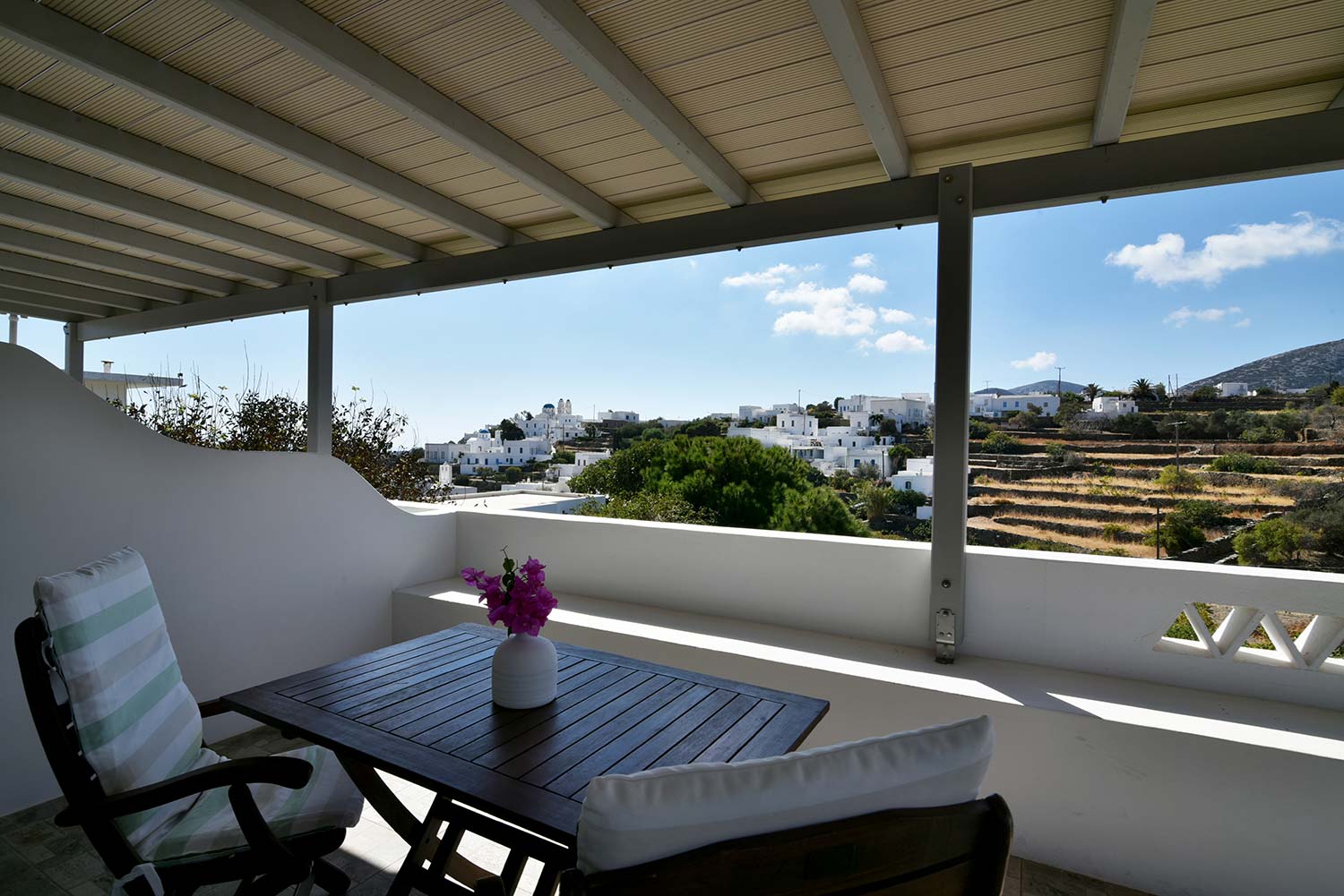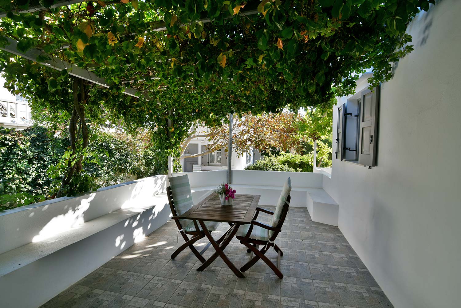 ενώ αυτό που θα σας κερδίσει είναι η νησιώτικη βεράντα με θέα προς τον καταπράσινο κήπο και τον παραδοσιακό οικισμό.