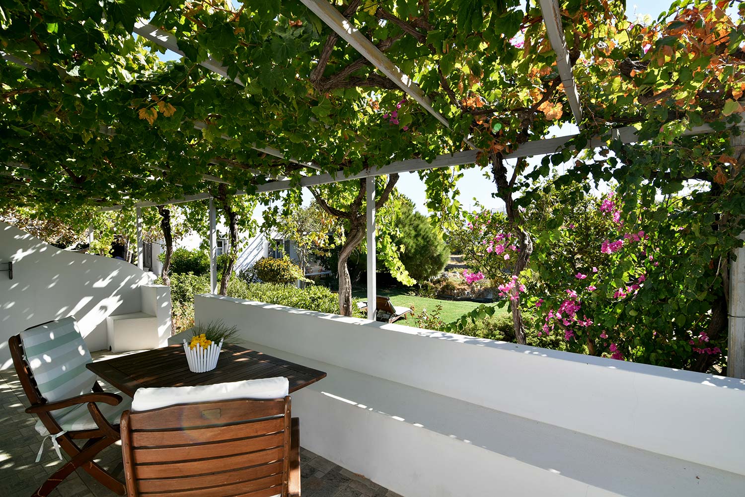 βρίσκεστε μέσα στον καλοκαιρινό, λουλουδιασμένο κήπο κάτω από την πυκνή σκιά της κληματαριάς για ώρες χαλάρωσης.