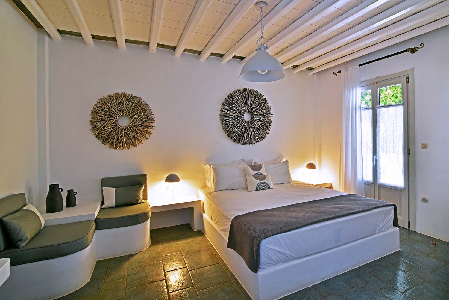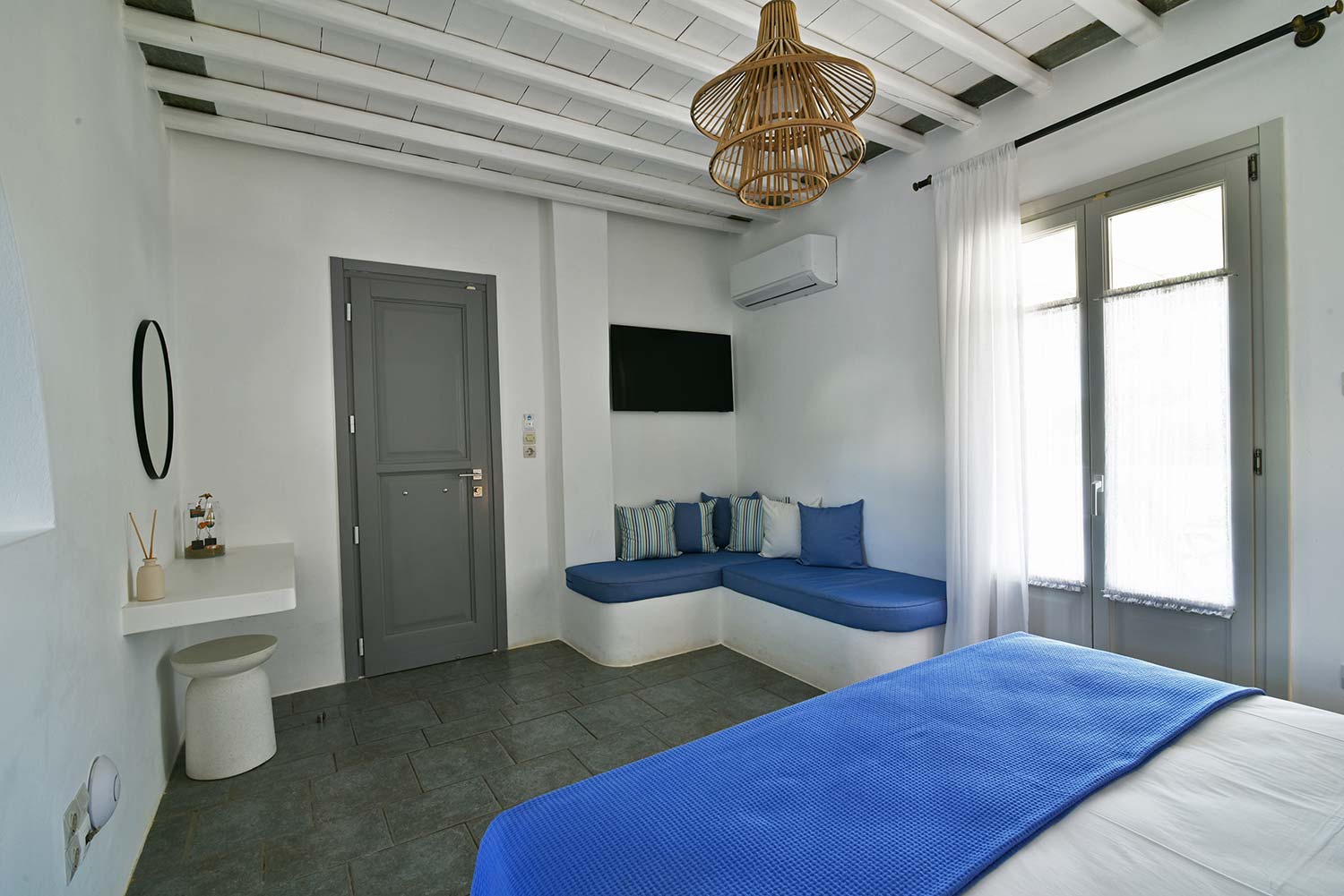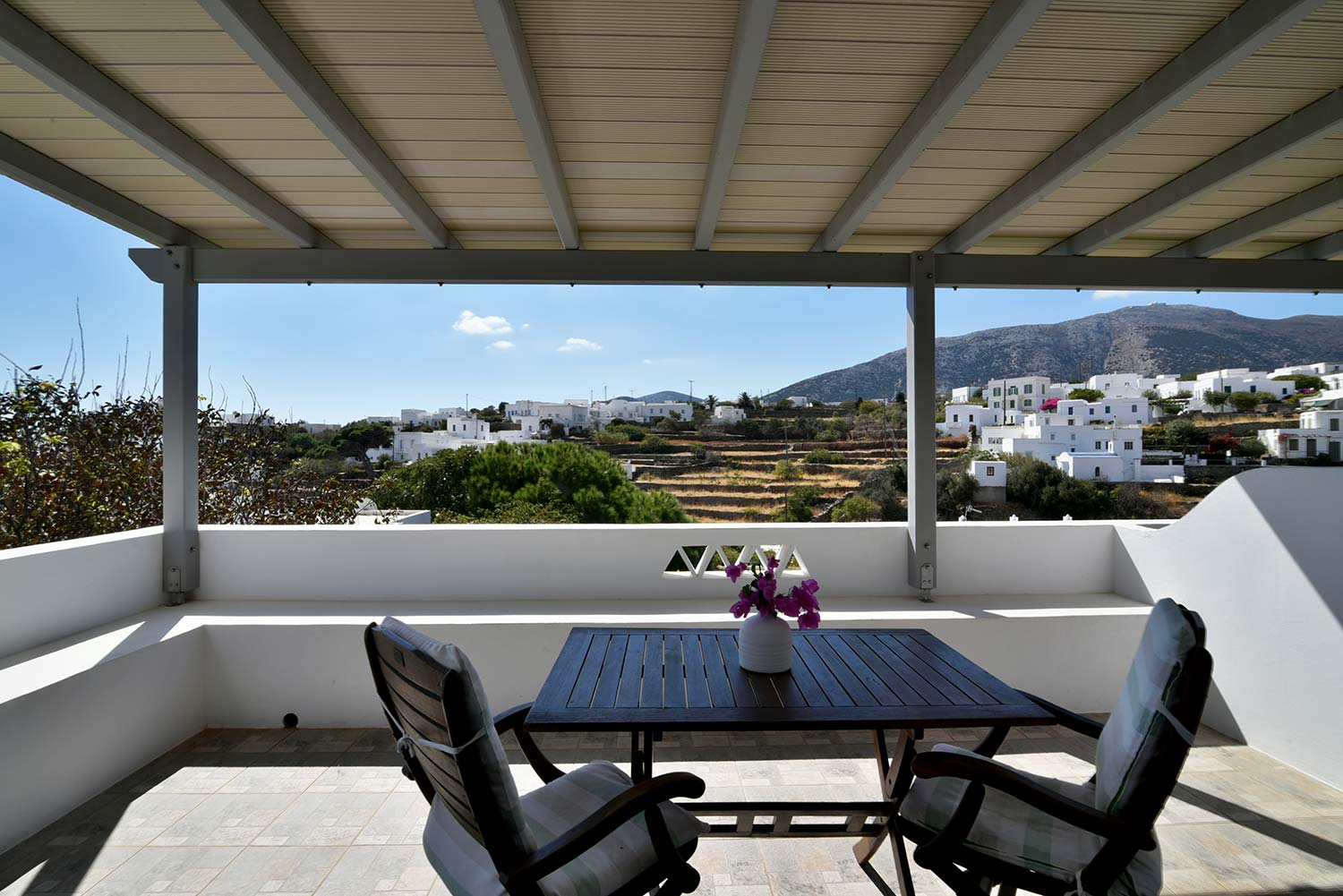ενώ αυτό που θα σας κερδίσει είναι η νησιώτικη βεράντα με θέα προς τον καταπράσινο κήπο και τον παραδοσιακό οικισμό.