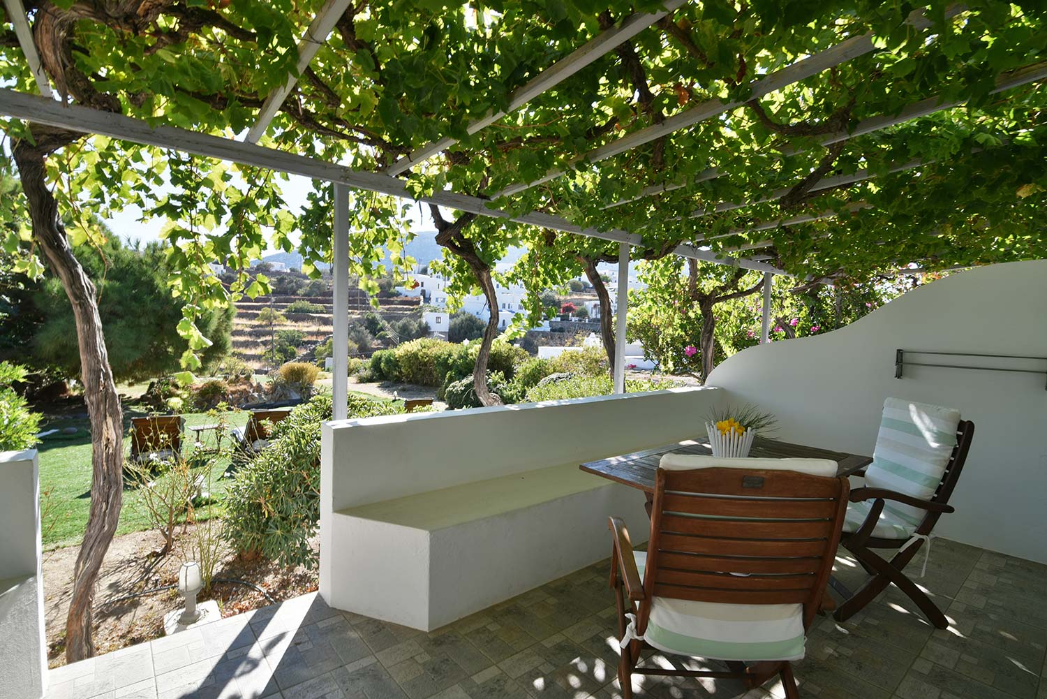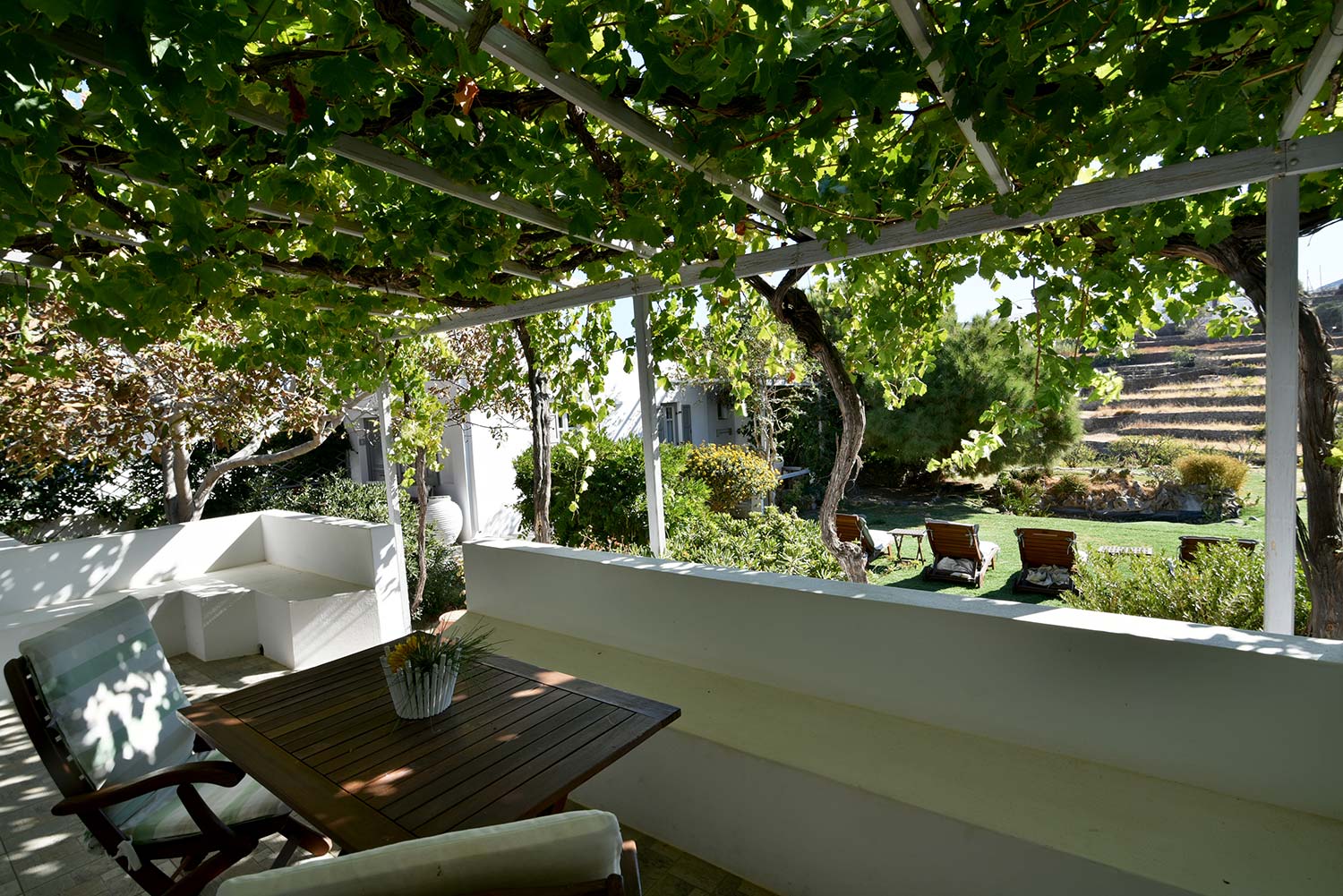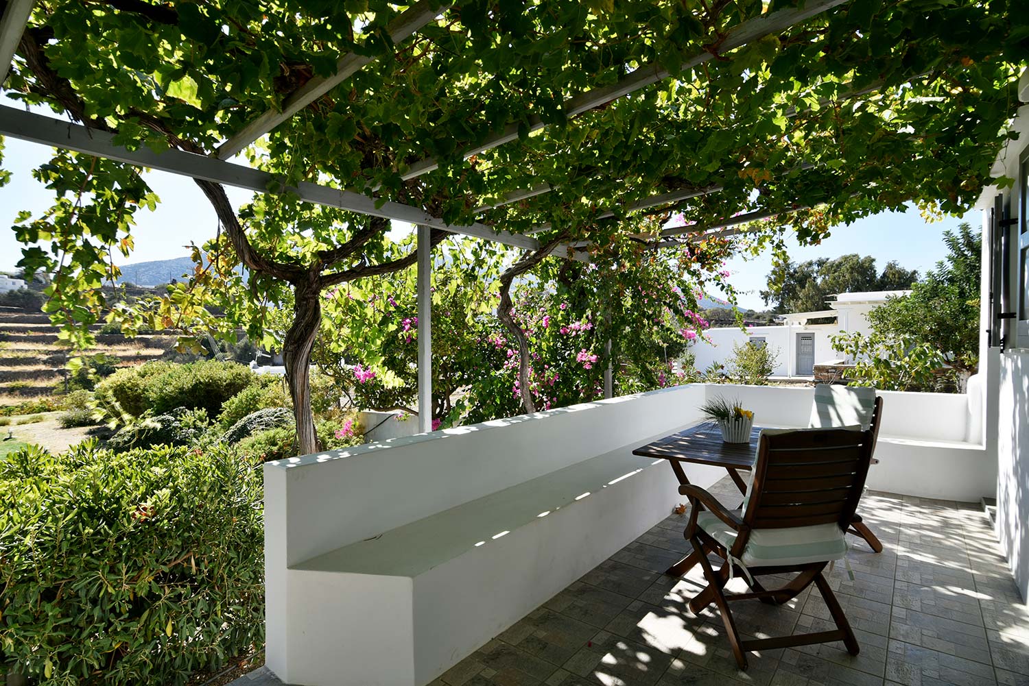 βρίσκεστε μέσα στον καλοκαιρινό, λουλουδιασμένο κήπο κάτω από την πυκνή σκιά της κληματαριάς για ώρες χαλάρωσης.